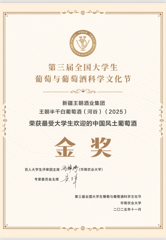 近日,以“中國風(fēng)土、中國味道、中國文化”為主題的第三屆全國大學(xué)生葡萄與葡萄酒科學(xué)文化節(jié)在華南農(nóng)業(yè)大學(xué)圓滿落幕。王朝半干白葡萄酒(河谷)(2025)憑借卓越的產(chǎn)品實力脫穎而出,榮獲“最受大學(xué)生歡迎的中國風(fēng)土葡萄酒金獎”。